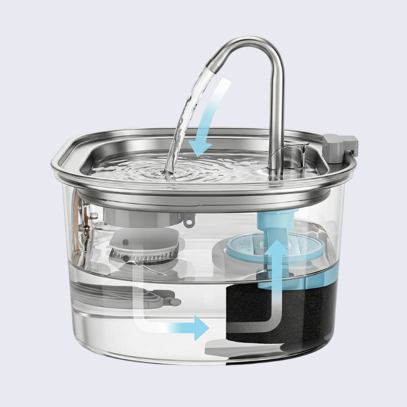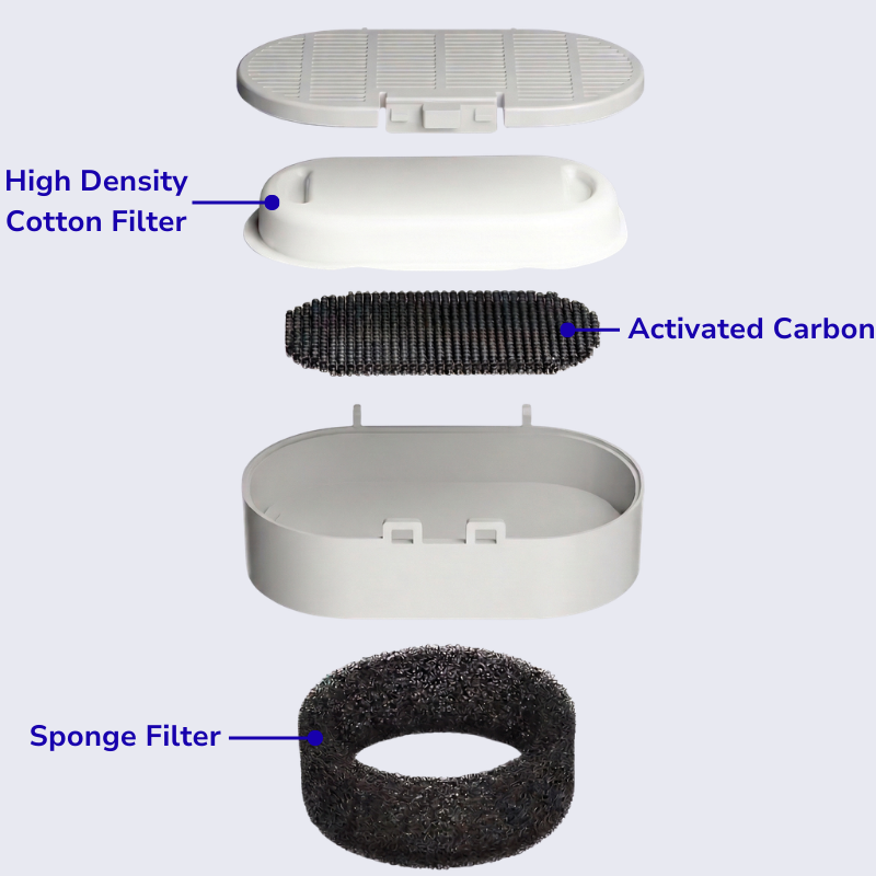 Dual-stage filtration removes bacteria, hair, debris and odour before it reaches your cat's mouth.
