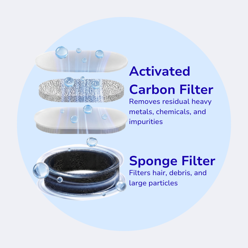Activated carbon removes odors and impurities. The pre-filter sponge catches hair and debris. Every drop is clean.